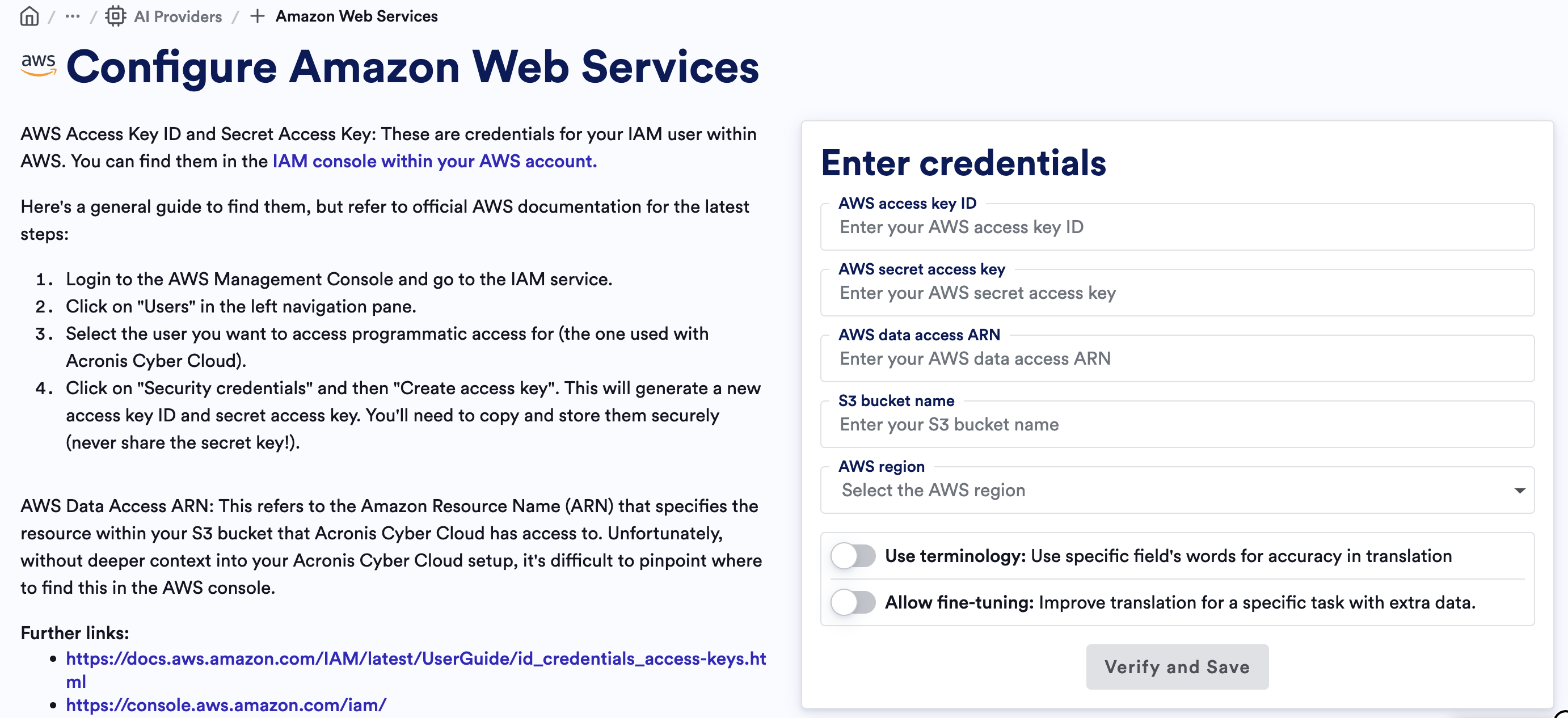Enter the required configurations for your LLM (e.g. API key, JSON credentials, bucket name, Password, etc). For more information on configuration details, see the relevant pages: