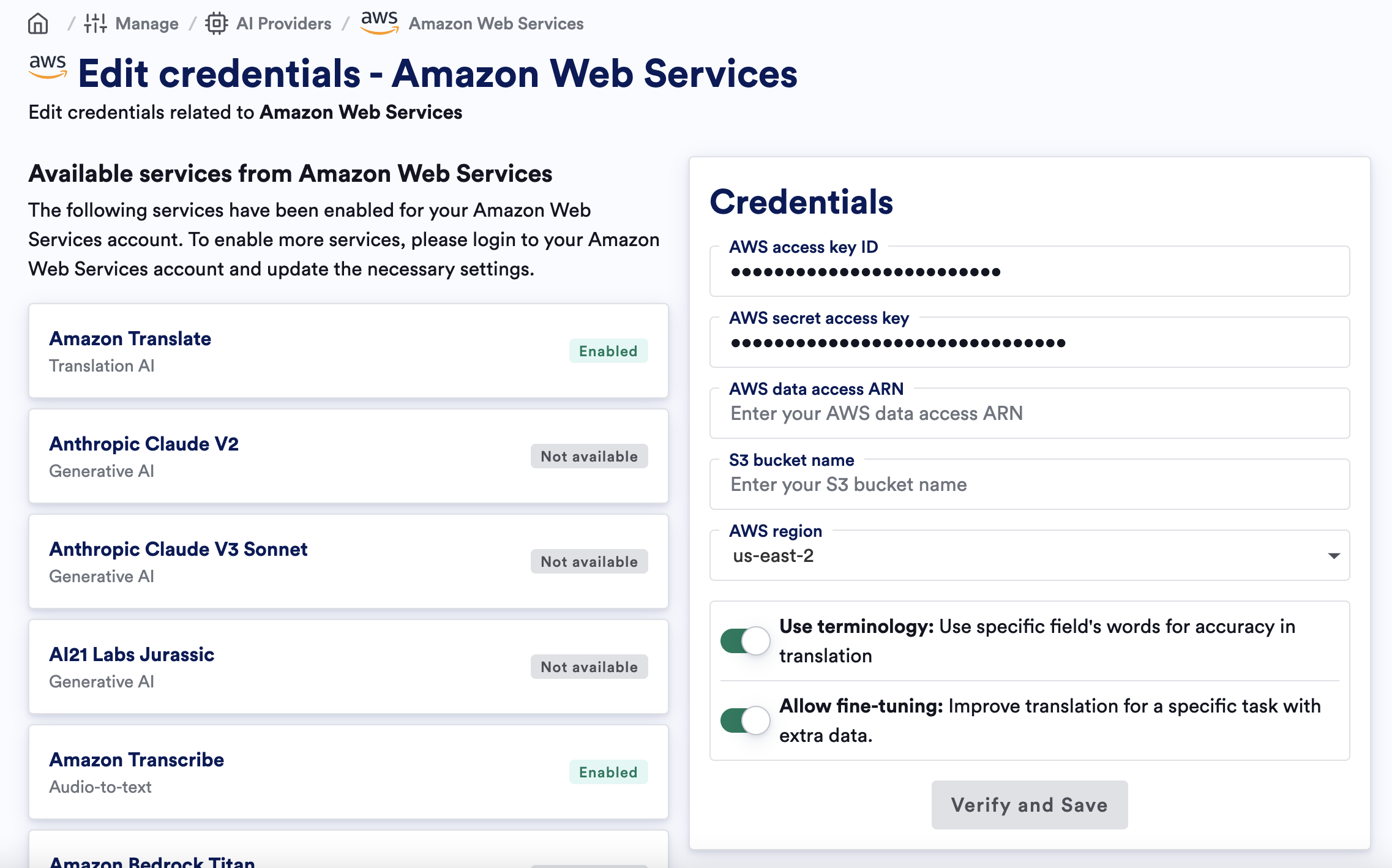 - Here you will see all of the different services (i.e. Translation, Create, etc.) you can access in LILT and the corresponding 3rd party AI services to power it in your platform.